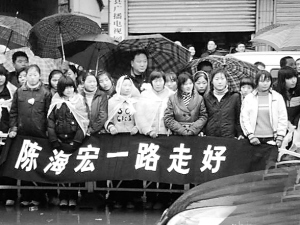 濤聲:2009年3月12日早晨,天空下著雨,上帝為失去一位好檢察官而哭泣!這天是鄲城人民的好兒子陳海宏出殯的日子!早晨8點(diǎn)20左右靈車駛?cè)胄氯A路。路兩邊站滿了送行的群眾,他們戴著白花,手拿條幅。靈車走得很慢,因?yàn)樗篮:旮绾芾?,好讓他多睡一?huì)。海宏哥走好,你是鄲城的嬌傲!