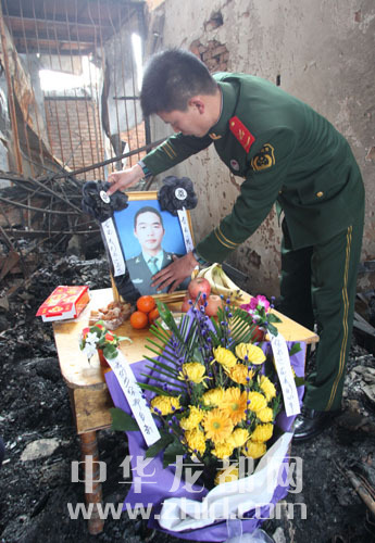 ????正月十五元宵節(jié),人們齊聚在鄭春光犧牲的那間不大的商鋪門前,在那間已經(jīng)被熏黑的墻壁上掛上潔白的小花:“鄭春光你是人民的好兒子”、“春光我們永遠(yuǎn)懷念你!”、“春光一路走好!”字字真情、句句感動,表達(dá)著人們對這位好男兒的無限哀思。人們端來了熱騰騰的湯圓放在鄭春光犧牲的門前,所有的人們面對春光犧牲的地方,為他們心中的英雄深深地鞠了三躬。一位淚流滿面的老人哽咽著:“春光,好孩子,我給你送元宵來了!好孩子,你吃點(diǎn)吧!吃點(diǎn)吧!”在場的人們哭聲一片。