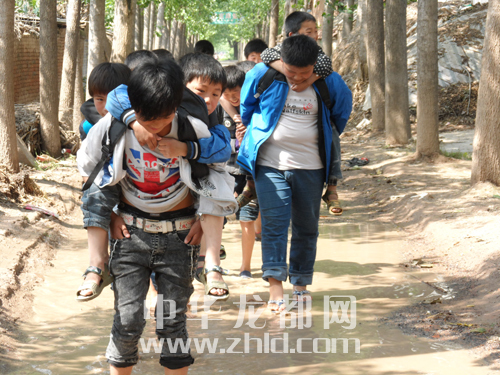 上學(xué)路上有段泥路,每逢下雨時(shí),大孩子幫助小孩子趟水走過(guò)????