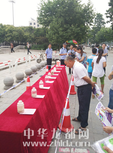 6月26日上午,在市區(qū)五一文化廣場(chǎng),一張長(zhǎng)桌上擺了冰毒、海洛因、嗎啡、咖啡因、搖頭丸、麻古、罌粟殼、可卡因等8種毒品。不少行經(jīng)此處的市民上前觀看,個(gè)別市民還拿出手機(jī)拍照。