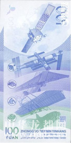 中國航天紀念鈔面額為100元,票面長155毫米,票面寬77毫米,中國航天紀念鈔主色調(diào)為藍色。正面主景圖案為神舟九號飛船與天宮一號交會對接圖案。左上方為國徽圖案、“中國人民銀行”行名,其下方為東方紅一號衛(wèi)星圖案。票面左下方為面額數(shù)字“100”和漢字“壹佰圓”。主景圖案右側(cè)為嫦娥一號衛(wèi)星圖案,其上方為面額數(shù)字“100”和“中國航天紀念”字樣。背面主景圖案由上至下依次為嫦娥一號衛(wèi)星圖案、2020年中國空間站“天宮”、噴氣式客機、馮如2號雙翼螺旋槳飛機、飛禽海東青圖案。票面左上角為風(fēng)箏局部圖案,右上角為面額數(shù)字“100”。票面下方為行長章與年號“2015”,中國人民銀行漢語拼音字母和蒙、藏、維、壯四種民族文字的“中國人民銀行”字樣與面額,面額數(shù)字“100”,漢語拼音字母“YUAN”。