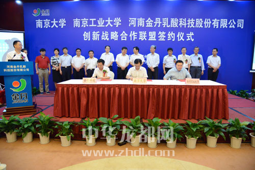 ????本報(bào)訊(記者 李莉) 7月9日上午,南京大學(xué)、南京工業(yè)大學(xué)、河南金丹乳酸科技股份有限公司創(chuàng)新戰(zhàn)略合作聯(lián)盟簽約儀式在鄭州舉行。副省長張維寧,中國工程院院士張全興,南京大學(xué)副校長談?wù)苊?,南京工業(yè)大學(xué)副校長喬旭,省科技廳廳長張震宇,市委書記、市人大常委會(huì)主任徐光,省環(huán)保廳副廳長師偉,市委常委、常務(wù)副市長劉保倉,市委常委、組織部長靳磊,副市長王田業(yè),及鄲城縣主要領(lǐng)導(dǎo)、河南金丹乳酸公司主要負(fù)責(zé)人出席簽約儀式。