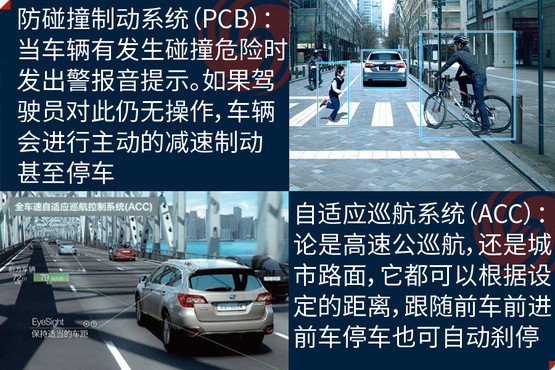 EyeSight駕駛輔助系統(tǒng)是避免事故發(fā)生,此次在中國(guó)市場(chǎng)亮相是它的第三代產(chǎn)品,其主要亮點(diǎn)是通過(guò)兩個(gè)模擬人眼的立體攝像頭,來(lái)監(jiān)控距離車(chē)輛前方100米以?xún)?nèi),高度在1米以上的人、車(chē)輛和物體,以減少傷害為目的的駕駛輔助系統(tǒng);除了距離以外,還可以對(duì)方向、高度大小等指標(biāo)進(jìn)行識(shí)別。它的主要功能分為四大類(lèi),分別是防碰撞制動(dòng)系統(tǒng)(PCB)、車(chē)速自適應(yīng)巡航控制系統(tǒng)(ACC)、起步油門(mén)誤操作預(yù)防系統(tǒng)和警報(bào)與提示系統(tǒng)。