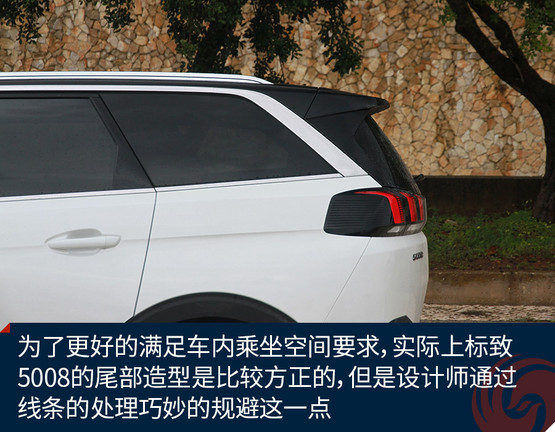 為了更好的滿足車內(nèi)乘坐空間要求,實(shí)際上標(biāo)致5008的尾部造型是比較方正的,但是設(shè)計(jì)師通過線條的處理巧妙的規(guī)避這一點(diǎn)。側(cè)窗鍍鉻裝飾在尾部快速下滑與尾燈相連接,上面后窗的部分則用黑色處理,使得標(biāo)致5008的視覺效果仍然充滿動(dòng)感,同時(shí)還保留了第三排空間的實(shí)用性。
