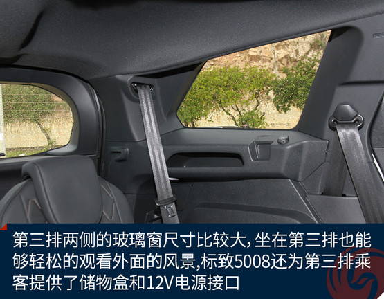 不過第三排也有值得表?yè)P(yáng)的地方,首先正如前面所說,由于車身設(shè)計(jì)的比較方正,所以第三排的頭部空間比較理想,并不覺得特別頂頭;另外,第三排兩側(cè)的玻璃窗尺寸比較大,坐在第三排也能夠輕松的觀看外面的風(fēng)景;最后,標(biāo)致5008還為第三排乘客提供了儲(chǔ)物盒和12V電源接口,能夠滿足基本的使用需求。
