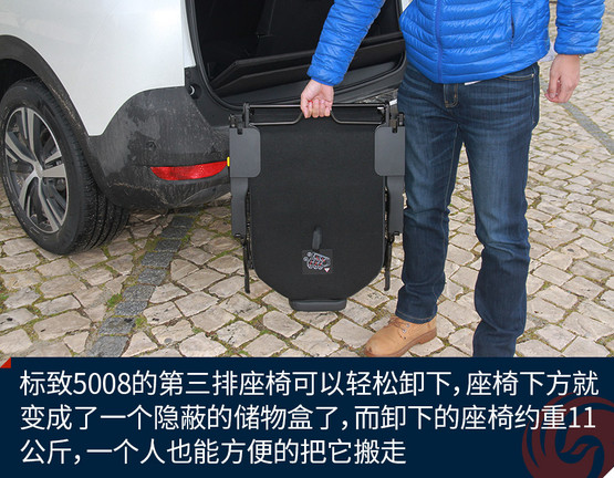 此處還有一個(gè)小Tips:標(biāo)致5008的第三排座椅可以輕松卸下,座椅下方就變成了一個(gè)隱蔽的儲(chǔ)物盒了,而卸下的座椅約重11公斤,一個(gè)人也能方便的把它搬走。