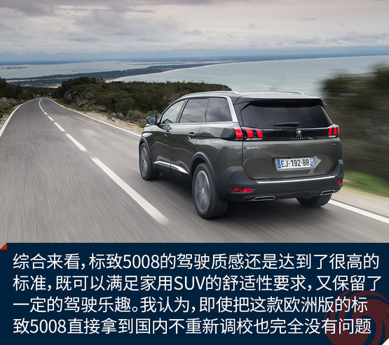 綜合來看,標(biāo)致5008的駕駛質(zhì)感還是達(dá)到了很高的標(biāo)準(zhǔn),既可以滿足家用SUV的舒適性要求,又保留了一定的駕駛樂趣。我認(rèn)為,即使把這款歐洲版的標(biāo)致5008直接拿到國(guó)內(nèi)不重新調(diào)校也完全沒有問題。