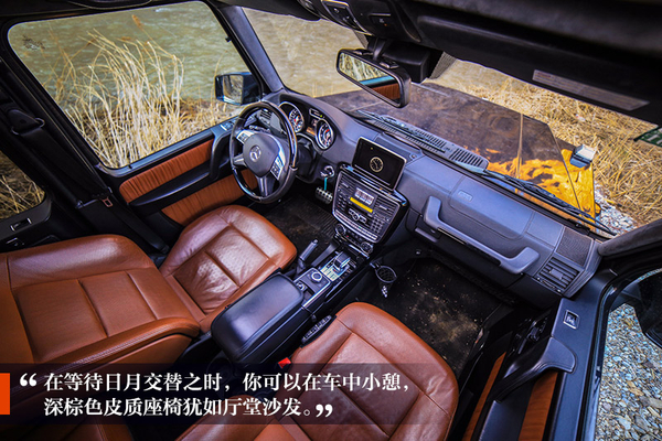 在等待日月交替之時,你可以在車中小憩,方殼子造型的車體,像是一個移動的居所,G 63 AMG中的深棕色皮質(zhì)座椅,就好似廳堂中的沙發(fā),供人高談、辨析、訴情、吹煙。中控九宮格數(shù)字“點唱機(jī)”,不再選擇聒噪的887,而是從中播出歲月的聲音,流出時間的經(jīng)典,隨著天色變暗,內(nèi)心也趨于平靜。