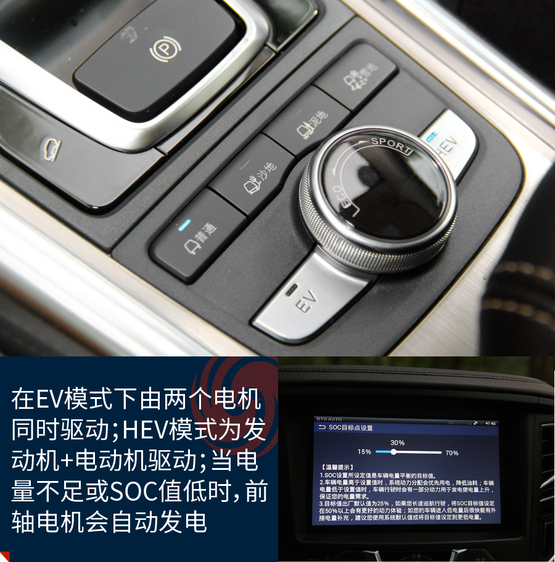 EV的純電模式下車輛由前后兩個(gè)電機(jī)同時(shí)驅(qū)動(dòng);在HEV的混動(dòng)模式下發(fā)動(dòng)機(jī)和雙電機(jī)都會(huì)提供動(dòng)力驅(qū)動(dòng)車輛;當(dāng)電量不足時(shí),前電機(jī)則轉(zhuǎn)變成發(fā)電機(jī),發(fā)動(dòng)機(jī)通過前電機(jī)為電池充電,同時(shí)也為前輪提供動(dòng)力,此時(shí)車輛由發(fā)動(dòng)機(jī)和后電機(jī)同時(shí)驅(qū)動(dòng)。