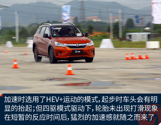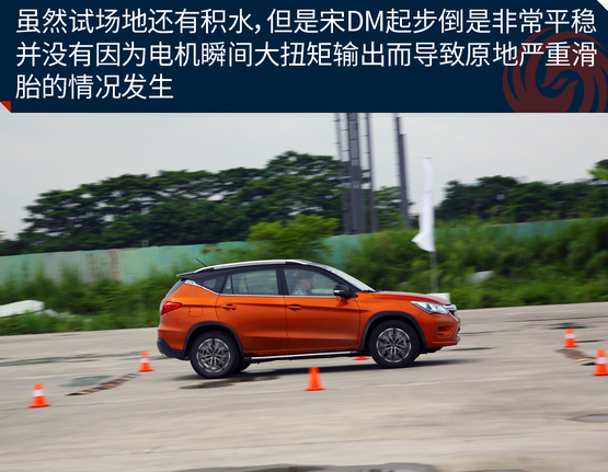 ????????為了充分體驗(yàn)宋DM的加速能力,我們?cè)谠囻{場(chǎng)地對(duì)其進(jìn)行了試駕體驗(yàn)。雖然試駕前一天下過雨,場(chǎng)地還有積水,但是宋DM起步倒是非常平穩(wěn)。并沒有因?yàn)殡姍C(jī)瞬間大扭矩輸出而導(dǎo)致原地嚴(yán)重滑胎的情況發(fā)生。經(jīng)過分析,出現(xiàn)這種情況的原因可能是宋DM全系標(biāo)配了ESP車輛穩(wěn)態(tài)控制系統(tǒng),因此在起步時(shí)或者濕滑路面上行駛也能保證平穩(wěn);另一個(gè)原因是宋DM搭配了全時(shí)電四驅(qū),車輛前后軸上各搭載有電機(jī),四輪驅(qū)動(dòng)讓車輛的動(dòng)力輸出更順暢和均衡。