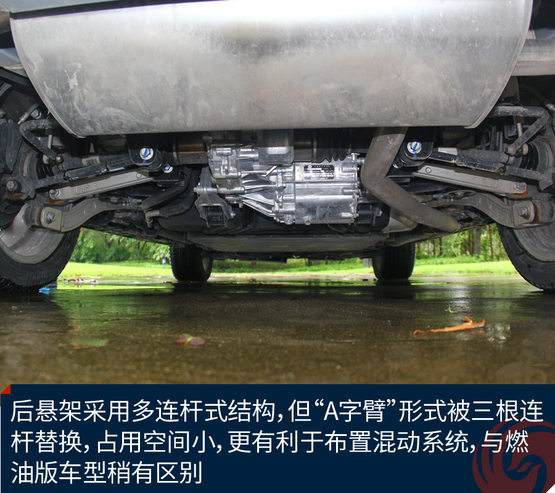 ????????由于電池放置在車輛的底盤和后備廂底部,降低了最小離地間隙。后懸架采用多連桿式結(jié)構(gòu),但“A字臂”形式被三根連桿替換,占用空間小,更有利于布置混動(dòng)系統(tǒng),與燃油版車型稍有區(qū)別。