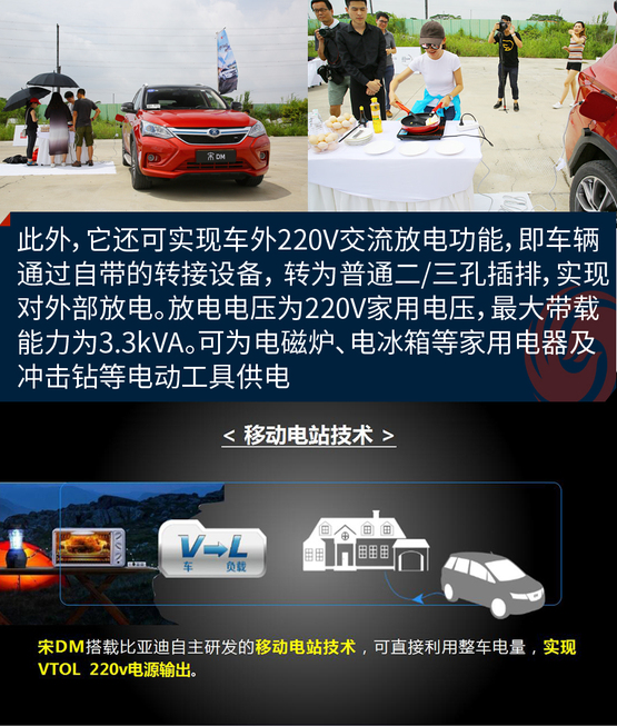 ????????宋DM可實(shí)現(xiàn)車外220V交流放電功能(VTOL),即車輛可通過自帶的轉(zhuǎn)接設(shè)備, 轉(zhuǎn)為普通二/三孔插排,實(shí)現(xiàn)對(duì)外部用電器放電。放電電壓為220V家用電壓,最大帶載能力為3.3kVA,給日常家用電器供電一點(diǎn)沒問題。