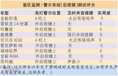 在測試當(dāng)中,車天下君留意到,不同品牌設(shè)定的盲區(qū)警示“激活”車速的要求不盡相同。在被譽(yù)為“安全之車”的沃爾沃XC60上,車天下君再度體驗了一把“低速”(低于30km/h)也有盲區(qū)警示的好感,甚至于在車天下君要在盲區(qū)有車的情況下仍要并線,或者與側(cè)向車輛距離太近,沃爾沃XC60都會發(fā)出蜂鳴聲,并在中控臺的抬頭系統(tǒng)中,發(fā)出紅色警示。而且,沃爾沃XC60最讓車天下君倍感好感的是,盲區(qū)紅色警示燈設(shè)置在兩邊的車內(nèi)A柱內(nèi)側(cè)上,駕駛員不需要費(fèi)勁,紅色警示燈就在視野范圍內(nèi)清晰看見。類似這樣將紅色警示燈放在A柱上的,還有全新軒逸,在這樣一款10萬元的車子上,搭載了BSW變道盲區(qū)預(yù)警系統(tǒng)很讓人驚喜,要知道如福特、科魯茲等都是高配車型才會有。而且,軒逸這套系統(tǒng)的提示可謂“無處不在”,一經(jīng)發(fā)現(xiàn)車輛進(jìn)入盲區(qū),BSW變道盲區(qū)預(yù)警系統(tǒng)就開始工作,通過儀表盤的TFT顯示屏、提示燈、提示音進(jìn)行預(yù)警,能有效降低變道盲區(qū)碰撞風(fēng)險。不過呢,以上這些提升好感度的安全警示效果,全新軒逸需要在車輛行駛速度>32km/h時才會“激活”。