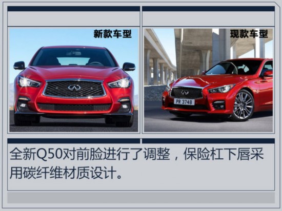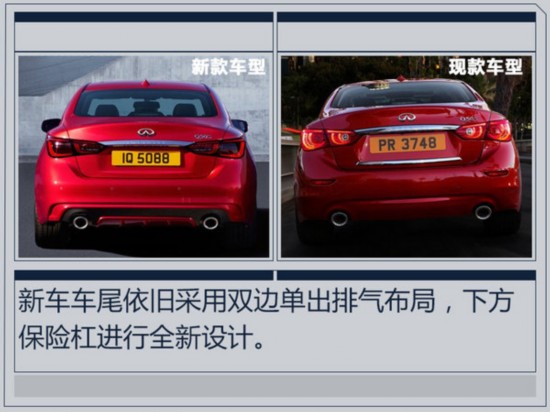 全新英菲尼迪Q50對外觀進行了調(diào)整,前臉采用上下分體式格柵設計,上格柵為網(wǎng)狀造型,保險杠下唇為碳纖維材質(zhì)。車尾取消了車牌下方鍍鉻飾條以及兩側(cè)反光板,下方保險杠換裝黑紅雙色護板。