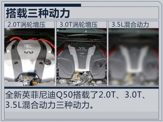 動力方面,全新英菲尼迪Q50搭載了2.0T、3.0T渦輪增壓發(fā)動機。2.0T渦輪增壓發(fā)動機最大功率155kW;3.0T渦輪增壓發(fā)動機最大功率298kW。此外,新車還增搭了一臺3.5L V6混合動力發(fā)動機,屆時油耗將大幅下降。