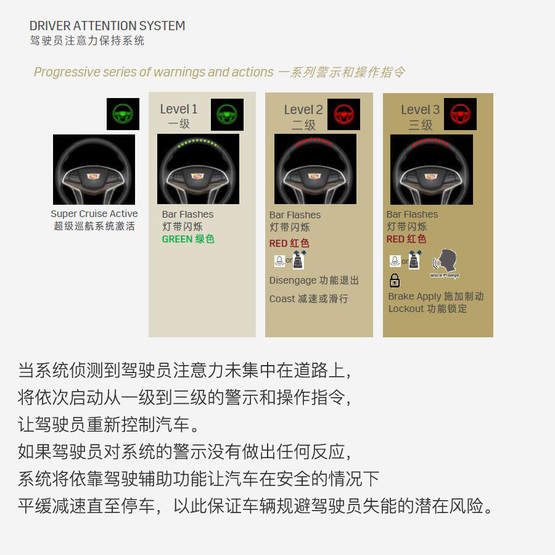 ????????若這個級別的警示還不能“喚醒”駕駛者,超級巡航系統(tǒng)將自動開啟雙閃、利用車輛輔助駕駛系統(tǒng)控制汽車逐漸減速并在路邊停車,然后OnStar安吉星工作人員將會通過遠(yuǎn)程對話介入以防止駕駛者因?yàn)椤笆堋痹斐筛嗖豢深A(yù)知的危險(xiǎn)。