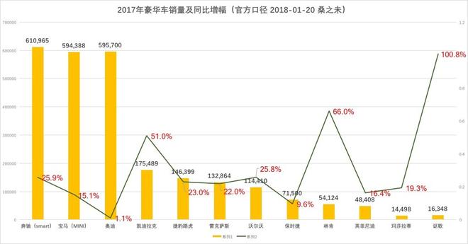 以官方披露的銷量口徑計(jì)算,奔馳(含smart)全年銷量為610,965輛,增長(zhǎng)25.9%,成為中國(guó)市場(chǎng)首家銷量超過(guò)60萬(wàn)輛的豪華車品牌,銷售總量名列第一;奧迪全年銷量為595,700輛,增長(zhǎng)1.1%;寶馬(含Mini)全年銷量為594,388輛,增長(zhǎng)15.1%。如果按單一品牌統(tǒng)計(jì),奧迪品牌銷量為595,700輛,寶馬品牌為56萬(wàn)輛,奔馳品牌(含v級(jí)車)為587,868輛,奧迪品牌蟬聯(lián)2017年中國(guó)豪華車第一。