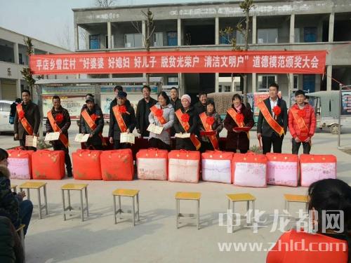 中華龍都網(wǎng)訊(周口報(bào)業(yè)全媒體記者 付永奇 趙永昌 文/圖))2月10日下午,商水縣平店鄉(xiāng)曾莊小學(xué)操場內(nèi),人頭攢動(dòng)、熱鬧非凡,村里評(píng)選出來的10位好婆婆、好媳婦、好兒子、清潔文明戶、脫貧光榮戶等“五好”群眾代表身披綬帶、胸戴紅花,臉上都洋溢著幸福的喜悅;一些民間文藝團(tuán)體分別助興表演了挑花籃、扇子舞、廣場舞等喜慶的節(jié)目,把現(xiàn)場氣氛烘托得異常隆重?zé)崃??!盀楹霌P(yáng)社會(huì)公德、家庭美德,提升群眾素質(zhì)和文明程度,春節(jié)來臨之際我們召開‘五好’表彰大會(huì),下面有請(qǐng)鄉(xiāng)黨委副書記、鄉(xiāng)長徐汝濤給大家講話......”隨著主持人、鄉(xiāng)紀(jì)委書記劉新光的開場白,臺(tái)下響起了一陣熱烈的掌聲?!伴_展好婆婆、好媳婦、好兒子、清潔文明戶、脫貧光榮戶等模范家庭人物評(píng)選是我鄉(xiāng)精神文明建設(shè)工作的一項(xiàng)重大舉措,也是脫貧攻堅(jiān)、農(nóng)村人居環(huán)境整治、文明鄉(xiāng)風(fēng)提升的部分內(nèi)容,更是弘揚(yáng)孝親敬老、勤勞致富、講究衛(wèi)生等優(yōu)良傳統(tǒng)的需要。全鄉(xiāng)各村都要通過召開評(píng)選表彰大會(huì),引導(dǎo)廣大人民群眾學(xué)先進(jìn)、爭先進(jìn),為文明和諧平店建設(shè)做出更大的貢獻(xiàn)......”徐汝濤提出殷切的希望。曾莊行政村“兩委”成員、駐村工作隊(duì)、第一書記及部分群眾200余人參加了會(huì)議。與會(huì)領(lǐng)導(dǎo)為此次層層推薦評(píng)選出的好婆婆、好媳婦、好兒子、清潔文明戶、脫貧光榮戶頒發(fā)了榮譽(yù)證書和獎(jiǎng)品。據(jù)村支部書記曾紀(jì)靈介紹,這些“五好”模范都有感人的故事,或是講究衛(wèi)生、勤儉持家,孝老敬親、患難與共;或是鄰里互助、脫貧致富;他們用實(shí)際行動(dòng)證明了自己對(duì)文明風(fēng)尚的價(jià)值追求,在生活中書寫了一個(gè)個(gè)接地氣的好故事,為廣大家庭樹立了好榜樣。受表彰的好婆婆胡秀英說:“把媳婦當(dāng)閨女,啥時(shí)候也不會(huì)吵架生氣......”清潔文明戶朱國申說:“農(nóng)村環(huán)境臟亂差,咱要帶頭改變它......”脫貧光榮戶劉前進(jìn)說:“國家扶貧政策好,不如早點(diǎn)摘掉貧困帽!”