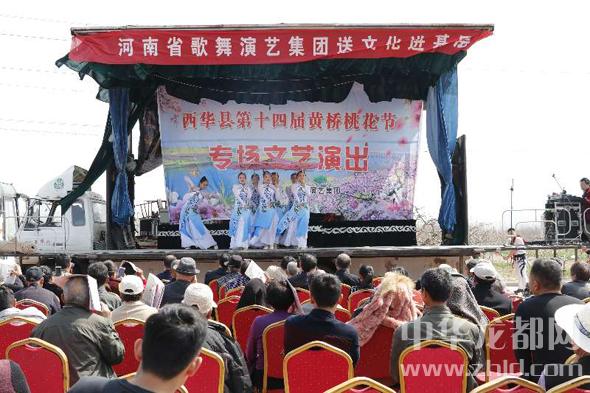 當日上午,在黃橋鄉(xiāng)萬畝桃園中,演員們用嘹亮的歌聲、動人的舞姿和精彩的雜技表演為當?shù)厝罕娂坝慰退蜕弦粓鲐S富多彩的文化大餐,不時博得觀眾陣陣掌聲。
