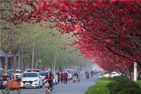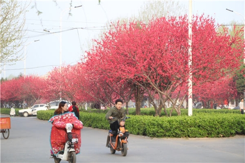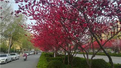 楊樹、垂柳、法桐,這是常見的綠化樹,可是你見過整條道路用桃樹做綠化的嗎?在周口市建設(shè)大道西段,長達1公里的主干道兩側(cè)種滿桃樹?,F(xiàn)在正值陽春三月桃花盛開,整條道路成了一片花的海洋,儼然是鬧市區(qū)里的世外桃源。