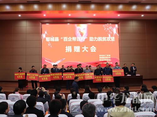 中華龍都網(wǎng)訊(周口報(bào)業(yè)全媒體記者 徐松 文/圖)4月13日,鄲城縣召開“百企幫百村”助力脫貧攻堅(jiān)捐贈(zèng)大會(huì),全縣129家企業(yè)反哺社會(huì)助力脫貧攻堅(jiān),現(xiàn)場(chǎng)捐贈(zèng)近1300萬(wàn)元。鄲城縣四個(gè)班子領(lǐng)導(dǎo)、部分縣處級(jí)領(lǐng)導(dǎo)干部、縣慈善會(huì)會(huì)長(zhǎng)、縣扶貧協(xié)會(huì)會(huì)長(zhǎng)、縣直各單位和鄉(xiāng)鎮(zhèn)負(fù)責(zé)人等參加捐贈(zèng)大會(huì)。縣委書記羅文閣發(fā)表講話,縣長(zhǎng)李全林主持會(huì)議。