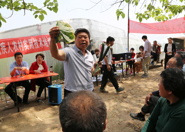 5月10日,在鹿邑縣馬鋪鎮(zhèn)完樓村殘疾人士付天軍的培訓(xùn)基地——蔬菜種植合作社助殘大棚內(nèi),來自鹿邑縣馬鋪鎮(zhèn)、渦北鎮(zhèn)產(chǎn)業(yè)集聚區(qū)的150多名建檔立卡貧困殘疾人,齊聚這里免費學(xué)習(xí)黃瓜種植技術(shù),付天軍在大棚內(nèi)手把手地進行指導(dǎo),來自華陽學(xué)校的農(nóng)業(yè)專家李中蘭也應(yīng)邀在大棚內(nèi)對常見的病蟲害進行詳細講解。