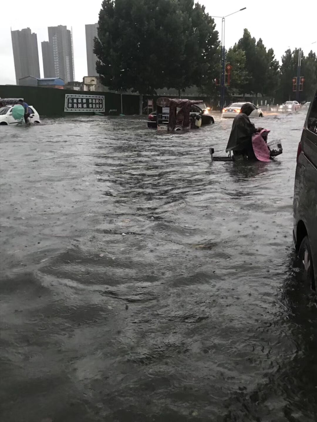 “在積水里行車必須加大油門,要不然積水容易倒灌進(jìn)入排氣管內(nèi)。”司機(jī)蔡先生說。而在周口市區(qū)慶豐街、五一路、光榮路等地的積水路段,均有車輛在水中拋錨。