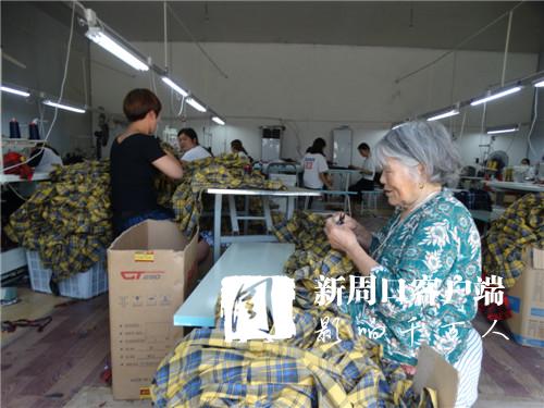 8月12日,在沈丘縣周營(yíng)鎮(zhèn)歐營(yíng)村一家服飾有限公司,當(dāng)?shù)氐牧羰貗D女正在加工訂單服裝。