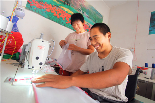“建舟,你去歇會兒,剩下的我來做?!蓖跷迥荽叽僦煞?,已經(jīng)好幾次了。“我不累,貨明天就要交,我再干會兒。”昨日上午,朱建舟坐在輪椅上,在改裝好的“手動縫紉機”上忙碌。