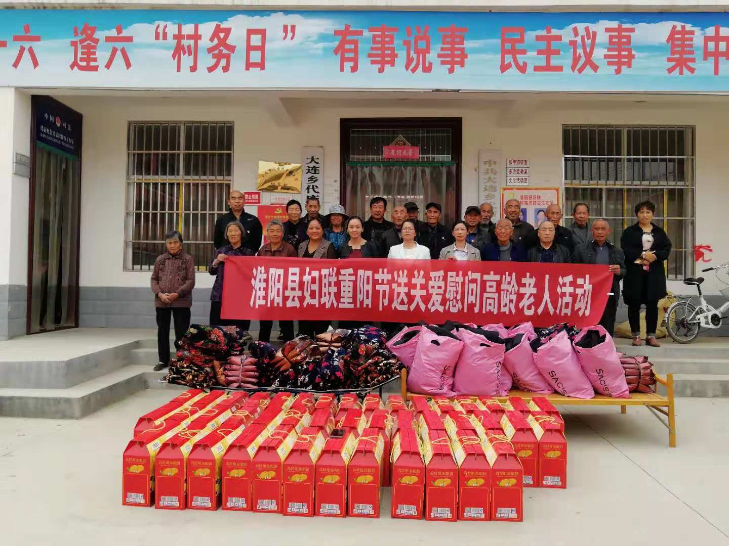 10月14日,淮陽縣婦聯(lián)駐大連鄉(xiāng)代廟行政村工作隊在代廟村開展每月農歷逢六主題黨日系列活動。為進一步深化黨性教育活動效果,縣婦聯(lián)結合即將而至的重陽節(jié),帶領黨員對全村43戶85歲以上高齡老人進行了逐一看望慰問,為每位老人送上一套高級棉襖、棉被,一件高纖維雜糧餅和親切的節(jié)日問候,共送去價值7000元的慰問品。