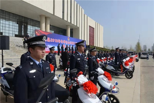 儀式上,縣領(lǐng)導(dǎo)為“百警駐百村”民警代表發(fā)放了第三批巡邏電動(dòng)車、臺(tái)式電腦、平板電腦等 “一村一警”警務(wù)裝備。儀式結(jié)束后,隨著梁建松一聲令下,公安民警統(tǒng)一登車,駛向大街小巷,開展第集中大巡邏。