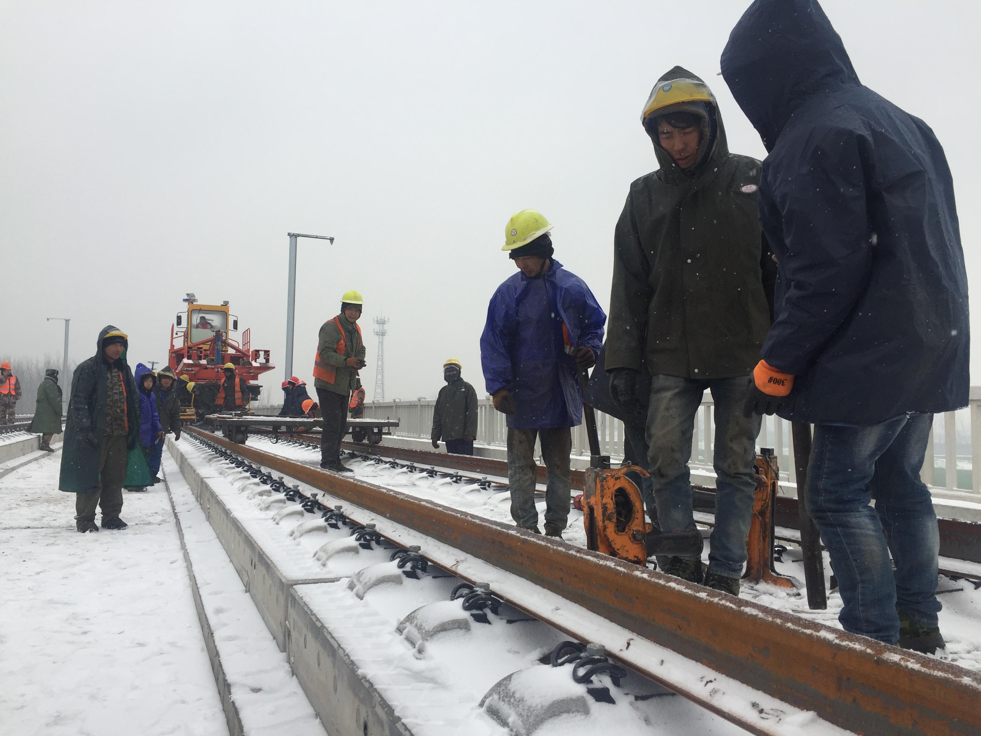 1月9日,漫天飛雪,寒氣逼人,鄭阜高鐵西華段建設(shè)現(xiàn)場卻熱火朝天。為確保工程建設(shè)如期推進(jìn),中鐵一局的工人們冒雪以每天至少5公里的速度進(jìn)行鋪軌作業(yè)。據(jù)了解,鄭阜高鐵西華段全長33公里,鋪軌工作預(yù)計5日內(nèi)完工。 記者 張猛 攝