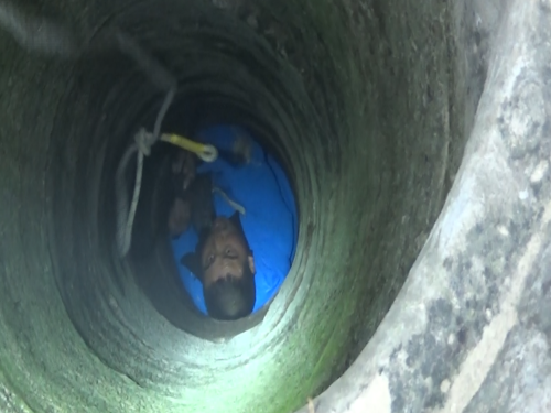 1月14日早上8時(shí)許,接到群眾報(bào)警后,淮陽縣消防大隊(duì)立即出動(dòng)一輛搶險(xiǎn)救援車、一輛水罐車及8名指戰(zhàn)員趕赴救援。到達(dá)現(xiàn)場后,民警發(fā)現(xiàn)男子掉進(jìn)一個(gè)沒有蓋的澆灌井內(nèi),井深約10米,井口直徑大約20公分。