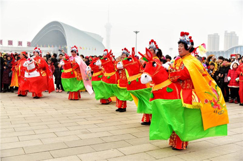展演現(xiàn)場,人頭攢動,鑼鼓喧囂,16名身穿金黃、亮藍衣服的舞龍隊員率先登場,金燦燦的巨龍時而甩尾前行,時而昂首盤踞,浩浩蕩蕩;8只舞獅歡騰雀躍、活靈活現(xiàn);精美的裝飾的旱船穿行其中,老生、老旦扮相的隊員邊走邊唱;整齊劃一的腰鼓隊以及隊形優(yōu)美的擔經(jīng)挑把現(xiàn)場氣氛推向高潮……持續(xù)近2小時的展演活動中,精彩的民俗表演令人目不暇接,為這座城市增添了濃濃的年味。