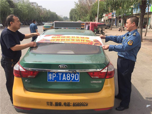由區(qū)五城聯(lián)創(chuàng)指揮部牽頭,組織區(qū)城管局、區(qū)交通運(yùn)輸局等職能部門(mén),利用城管執(zhí)法車(chē)輛、環(huán)衛(wèi)保潔車(chē)輛、交通執(zhí)法車(chē)等,統(tǒng)一張貼宣傳標(biāo)語(yǔ)進(jìn)行宣傳。日出動(dòng)各類宣傳車(chē)輛109輛。區(qū)五城聯(lián)創(chuàng)指揮部辦公室會(huì)同區(qū)交通運(yùn)輸局在中心城區(qū)出租車(chē)上統(tǒng)一張貼創(chuàng)衛(wèi)宣傳標(biāo)語(yǔ)和禁煙標(biāo)志,累計(jì)張貼出租車(chē)600余輛。多種載體宣傳。利用車(chē)體標(biāo)語(yǔ)、車(chē)載音響、大喇叭、出租車(chē)頂燈等載體,大密度宣傳創(chuàng)衛(wèi)標(biāo)語(yǔ)口號(hào),播放統(tǒng)一灌制的創(chuàng)衛(wèi)宣傳音頻。