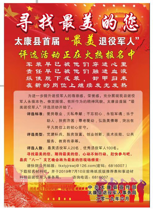 為進(jìn)一步提升退役軍人的尊崇感、榮譽(yù)感,充分展現(xiàn)全縣退役軍人永葆本色、奮發(fā)圖強(qiáng)、有所作為的精神風(fēng)貌,太康縣委宣傳部、太康縣退役軍人事務(wù)局從即日起聯(lián)合開展首屆“最美退役軍人”評選活動,對全縣退役軍人中涌現(xiàn)出來的黨建標(biāo)兵、脫貧致富、創(chuàng)業(yè)創(chuàng)新、技術(shù)技能、公共服務(wù)、教育傳承等方面典型代表進(jìn)行評選表彰。