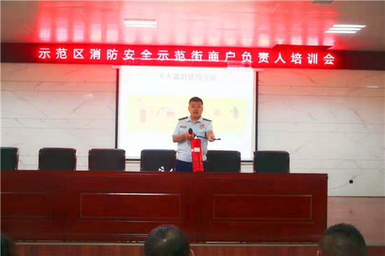 會(huì)上,高磊通過(guò)視頻向大家展示了近年典型的“九小場(chǎng)所”火災(zāi)案例,并分析了火災(zāi)發(fā)生的原因,讓各場(chǎng)所負(fù)責(zé)人充分認(rèn)識(shí)到了消防安全工作的重要性。同時(shí)結(jié)合單位的行業(yè)性質(zhì)和消防工作實(shí)際,為大家講解了日常消防安全常識(shí)、日常工作和生活火災(zāi)預(yù)防、常見(jiàn)火災(zāi)撲救知識(shí)、火場(chǎng)如何逃生自救等注意事項(xiàng),并現(xiàn)場(chǎng)演示了滅火器的正確使用方法。他強(qiáng)調(diào),各場(chǎng)所負(fù)責(zé)人要提高消防意識(shí),加強(qiáng)單位員工消防宣傳教育培訓(xùn),要充分認(rèn)識(shí)到示范街建設(shè)工作的重要性和必要性,做到安全自查、隱患自改、責(zé)任自負(fù)。