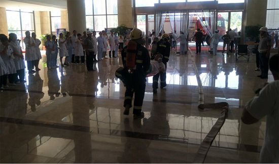 此次演練模擬一個(gè)蒙面歹徒在該縣六樓某科室打砸并故意縱火,轄區(qū)公安干警、消防指戰(zhàn)員及醫(yī)院保安力量迅速出動(dòng)處置,防恐人員及時(shí)將犯罪分子制服,而此時(shí)醫(yī)院內(nèi)火災(zāi)迅速蔓延,多名醫(yī)護(hù)人員被困火場(chǎng)無(wú)法逃生,醫(yī)院負(fù)責(zé)人通過(guò)應(yīng)急廣播進(jìn)行人員疏散,消防指戰(zhàn)員按照預(yù)定應(yīng)急處置方案迅速展開(kāi)滅火救援行動(dòng)。