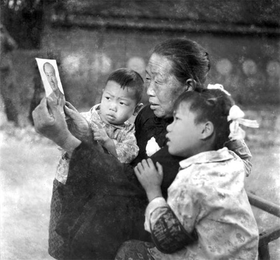 1976年9月,全國上下沉浸在毛主席逝世的悲痛中,老人為孩子戴上白布花,對著毛主席照片說心里話。