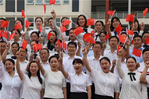 伴隨著琵琶悠揚的旋律,在場人員揮舞手臂,舞動國旗,共同唱響《我和我的祖國》。激情澎湃的歌聲響徹第二實驗小學每一個角落,訴說著鄲城教育人對祖國的衷心熱愛和真誠歌頌。