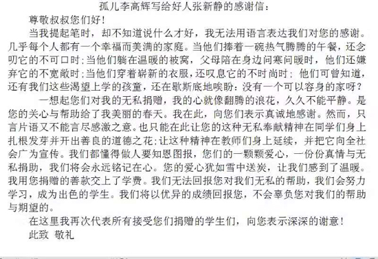 為表示對(duì)張新靜等人大代表的感謝,隨后,李高輝給張新靜寫了一封感謝信。信中,他表示,自己一定不辜負(fù)大家的期望,以后會(huì)更加努力學(xué)習(xí),回饋社會(huì),回報(bào)大家。“他是一個(gè)懂得感恩的孩子,讀了他的來(lái)信,我感到很欣慰?!睆埿蚂o說(shuō)。