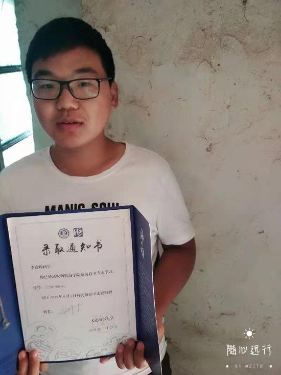 據(jù)了解,李高輝是一個(gè)命苦的孩子,很小的時(shí)候父親因病去世,母親改嫁,無(wú)奈,他只好跟隨年邁多病的爺爺奶奶一起生活,家庭十分拮據(jù)。俗話說(shuō),窮人的孩子早當(dāng)家。李高輝從小學(xué)就知道勤奮學(xué)習(xí),養(yǎng)成了不懼困難,愛(ài)幫助別人的性格,深受師生喜愛(ài)。經(jīng)過(guò)10多年努力拼搏,2019年高考,他以優(yōu)異的成績(jī)被大連海事大學(xué)航空學(xué)院錄取。