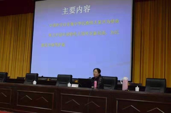 姚巧華從“新時(shí)代中國(guó)外交堅(jiān)持以實(shí)現(xiàn)中華民族偉大復(fù)興為使命”“努力開(kāi)創(chuàng)中國(guó)特色大國(guó)外交新局面,為民族復(fù)興保駕護(hù)航”兩個(gè)大方面,深刻闡述了“習(xí)近平新時(shí)代中國(guó)特色社會(huì)主義外交思想”。所講觀點(diǎn)鮮明,重點(diǎn)突出,講法靈活,圖文并茂,事例貼切,語(yǔ)言精準(zhǔn),理論性強(qiáng),具有很強(qiáng)的指導(dǎo)性。