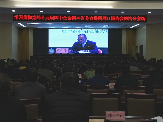 根據(jù)省委統(tǒng)一部署,11月27日,學(xué)習(xí)貫徹黨的十九屆四中全會(huì)精神省委宣講團(tuán)報(bào)告會(huì)在周口市舉行,扶溝縣四個(gè)班子領(lǐng)導(dǎo)和縣直各單位負(fù)責(zé)人在扶溝分會(huì)場(chǎng)聆聽宣講報(bào)告。