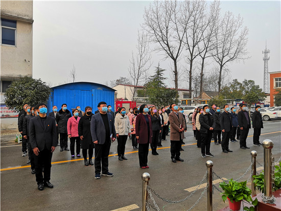 按照疫情防控復產復工工作安排,2月24日為恢復上班的第一天。8時許,西華縣聶堆鎮(zhèn)政府全體干部衣冠莊重、佩戴口罩、按照間隔1.5米的距離整齊地站在國旗臺前共同舉行隆重的升國旗儀式,以一種不一樣的方式打開新的工作局面。