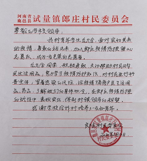 “龍九合同學(xué)積極勇敢,主動(dòng)幫村民購(gòu)買(mǎi)生活用品,努力學(xué)習(xí)疫情防護(hù)知識(shí),對(duì)村民進(jìn)行科普宣傳,冒著感染的風(fēng)險(xiǎn)給疫情隔離戶(hù)送生活用品、藥品,在我村疫情防控的戰(zhàn)役中表現(xiàn)突出,得到村鎮(zhèn)領(lǐng)導(dǎo)的稱(chēng)贊,感謝學(xué)校給我們培養(yǎng)了一名好青年……”這是一封要寄往周口師范學(xué)院的感謝信,落款為鹿邑縣試量鎮(zhèn)郎莊行政村村民委員會(huì)。