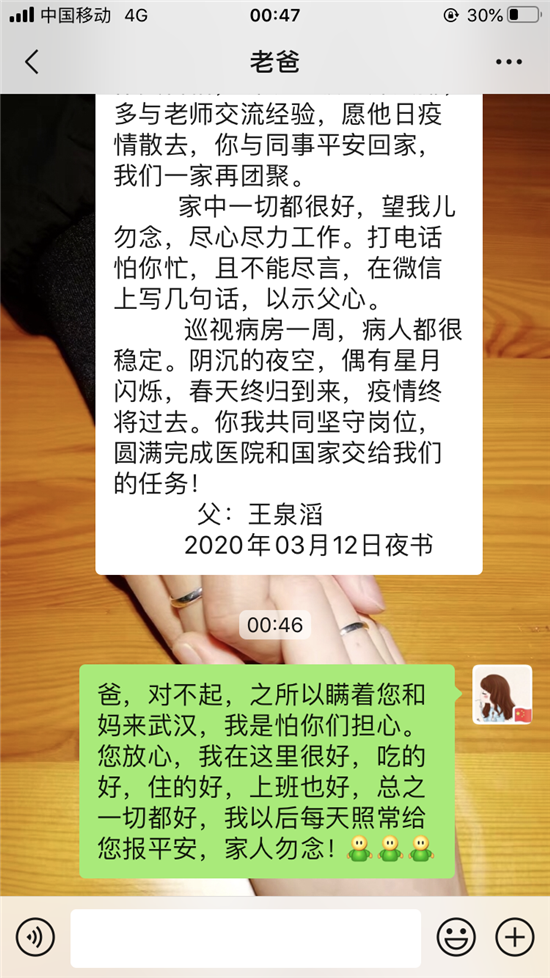 3月13日0時(shí)許交完班的王孟杰看到這封家書后,淚如雨下。平復(fù)心情后的她給父親回了這么一段話:“爸,對不起,之所以瞞著您和媽來武漢,是怕你們擔(dān)心。您放心,我在這里很好,吃得好、住得好,上班也好,總之一切都好。我以后每天照常給您報(bào)平安,家人勿念?!?/p>