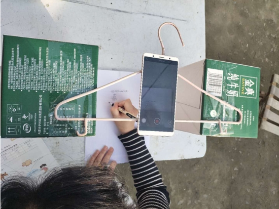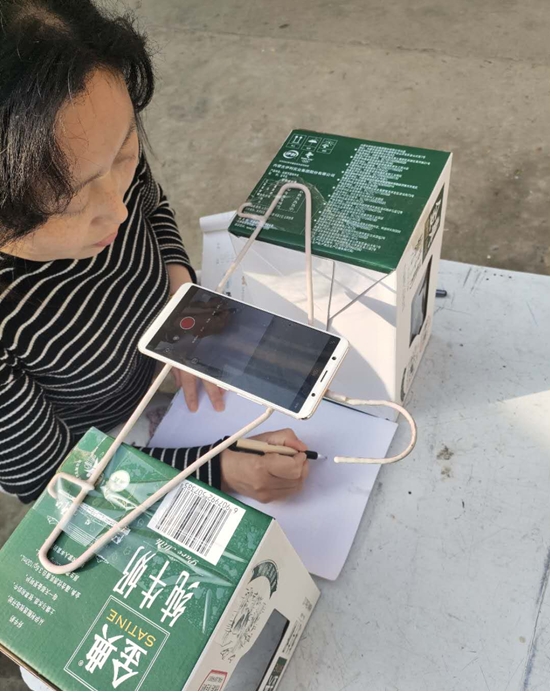 在備課時(shí),朱霞很快遇到了難題:手機(jī)沒(méi)法固定,街上手機(jī)店又全部停業(yè),網(wǎng)上買的手機(jī)固定夾發(fā)不了貨。為了不耽誤學(xué)生上課,她想到用晾衣?lián)?、牛奶箱做成?jiǎn)易支架,組裝后居然效果不錯(cuò)。就這樣,一個(gè)晾衣?lián)巍蓚€(gè)牛奶箱和一部手機(jī)組成了她的“三尺講臺(tái)”。