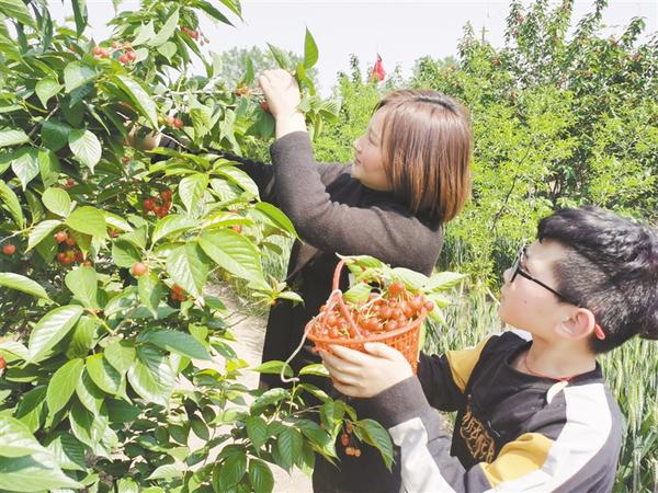 4月26日,在淮陽區(qū)豆門鄉(xiāng)武灣村的櫻桃采摘園內(nèi),人們享受著采摘的樂趣。武灣村農(nóng)民利用地理優(yōu)勢種植櫻桃、草莓等,吸引附近的民眾前來采摘,成為當(dāng)?shù)氐奶厣a(chǎn)業(yè)。記者 孫安平 攝