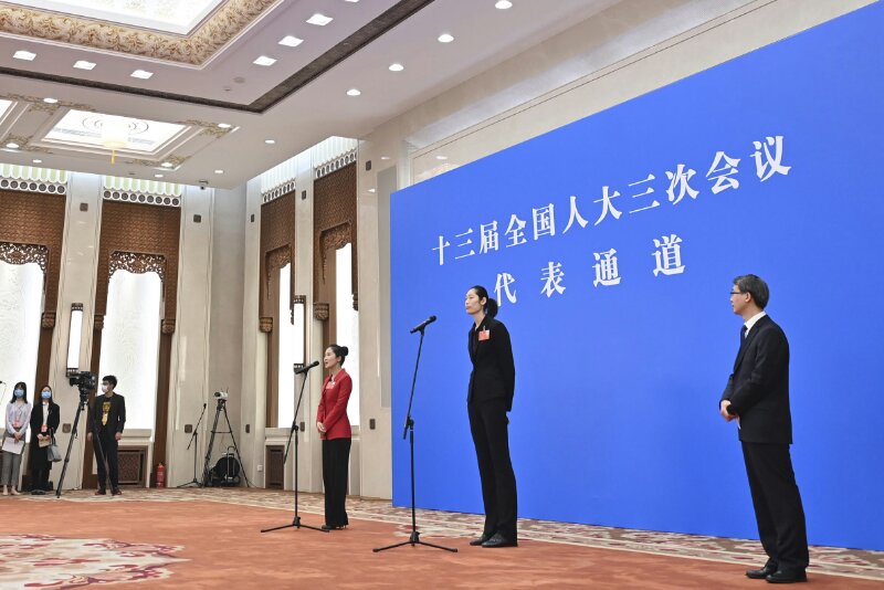 5月22日,第十三屆全國人民代表大會(huì)第三次會(huì)議舉行首場(chǎng)“代表通道”采訪活動(dòng)。這是全國人大代表朱婷(右二)通過網(wǎng)絡(luò)視頻方式接受采訪。新華社記者 劉金海 攝